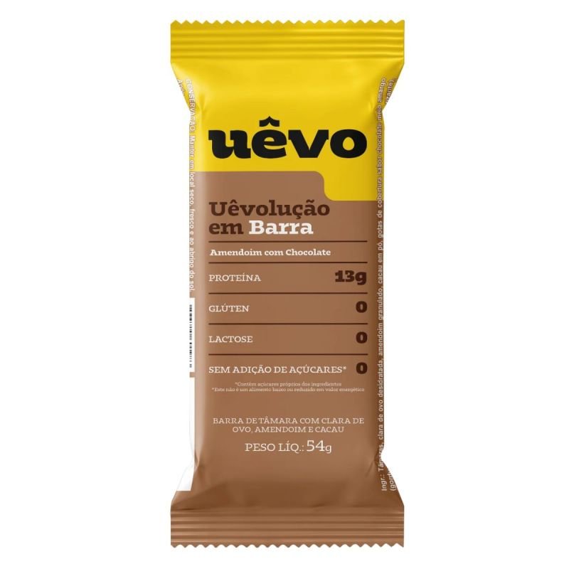 A barra Uêvo sabor Amendoim com Chocolate foi pensada para quem precisa de praticidade, mas não abre mão de um lanche gostoso e funcional.