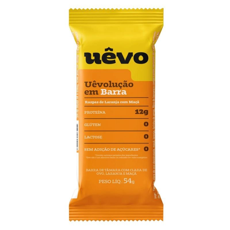 A barra Uêvo sabor raspas de laranja com maçã entrega 54g de sabor refrescante e nutrição equilibrada. Sem glúten, sem lactose e sem adição de açúcares, é macia, prática e perfeita para completar sua rotina com mais energia.