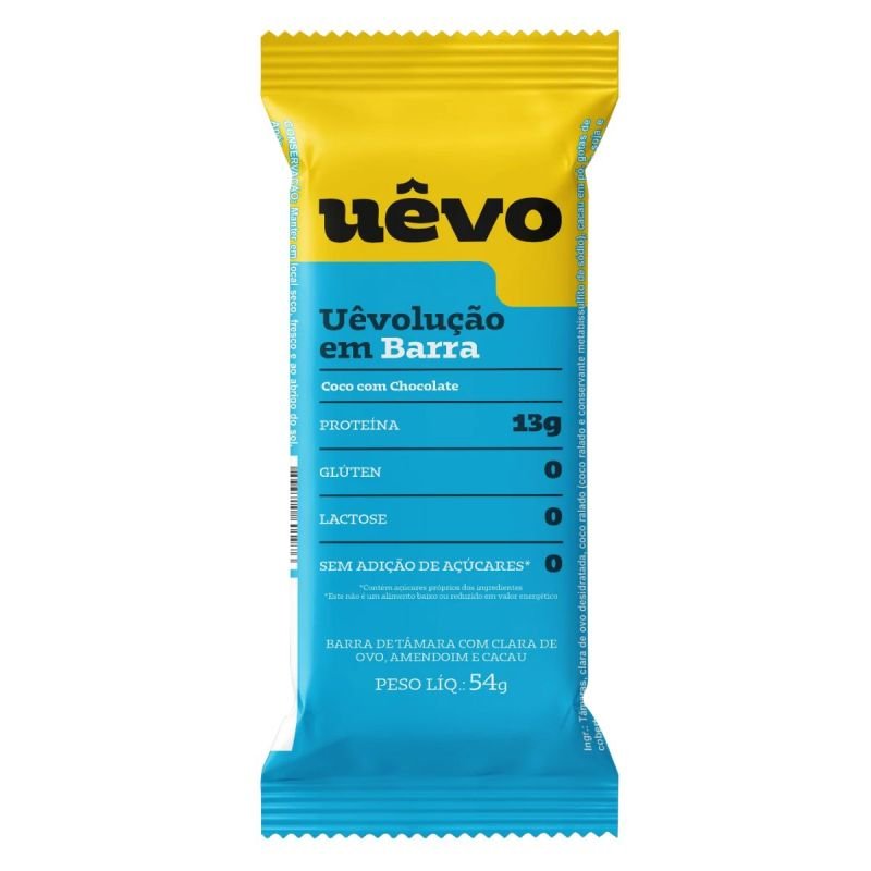 A barra Uêvo sabor coco com chocolate é prática, saborosa e nutritiva na medida certa. Com 13g de proteína, é uma excelente opção de lanche sem glúten, sem lactose e sem adição de açúcares, perfeita para sua rotina.