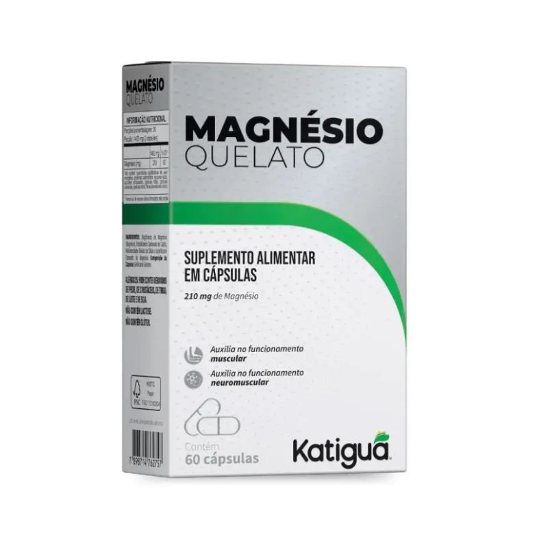 O Magnésio Quelato 210mg 60 Cápsulas Katiguá é um suplemento mineral formulado com magnésio na forma quelada, que apresenta alta biodisponibilidade e melhor tolerabilidade gastrointestinal quando comparado a formas inorgânicas do mineral. A quelação consiste na ligação do magnésio a um aminoácido, favorecendo sua absorção intestinal e reduzindo desconfortos como diarreia ou distensão abdominal.
